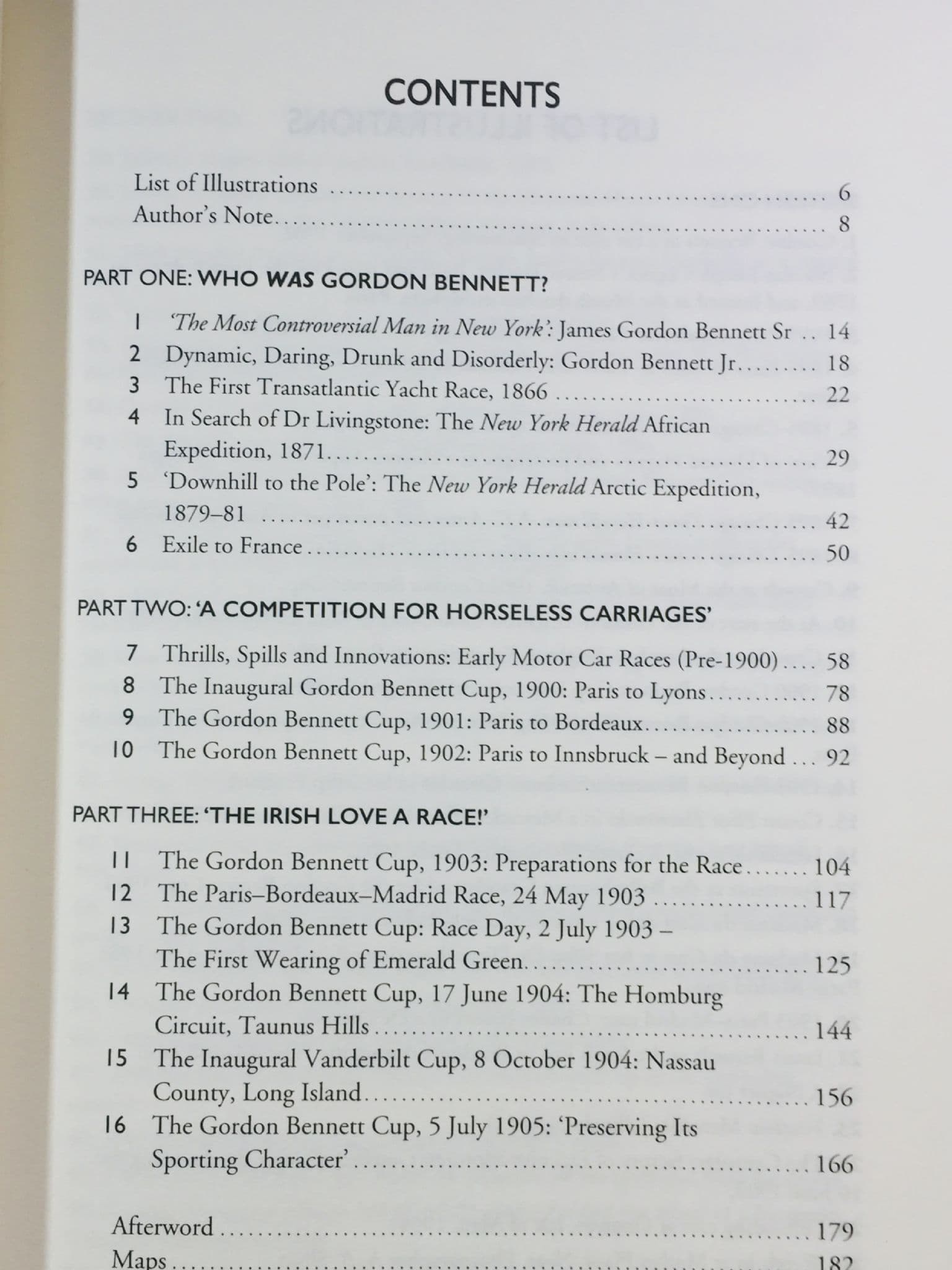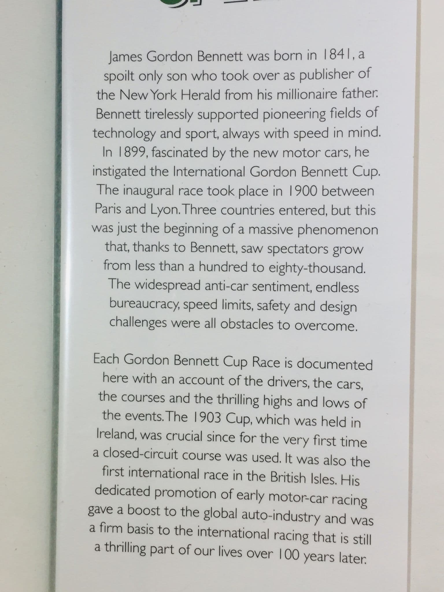 "GORDON BENNETT THE FATHER OF INTERNATIONAL MOTOR RACING"  biography of the wealthy American-in-Paris newspaper magnate who funded the first really major series on motor races at the dawn of the 20th century. They brought organisation, prestige and cohesion to a young sport and led directly to the Grand Prix Racing we are more familiar with tyoday.