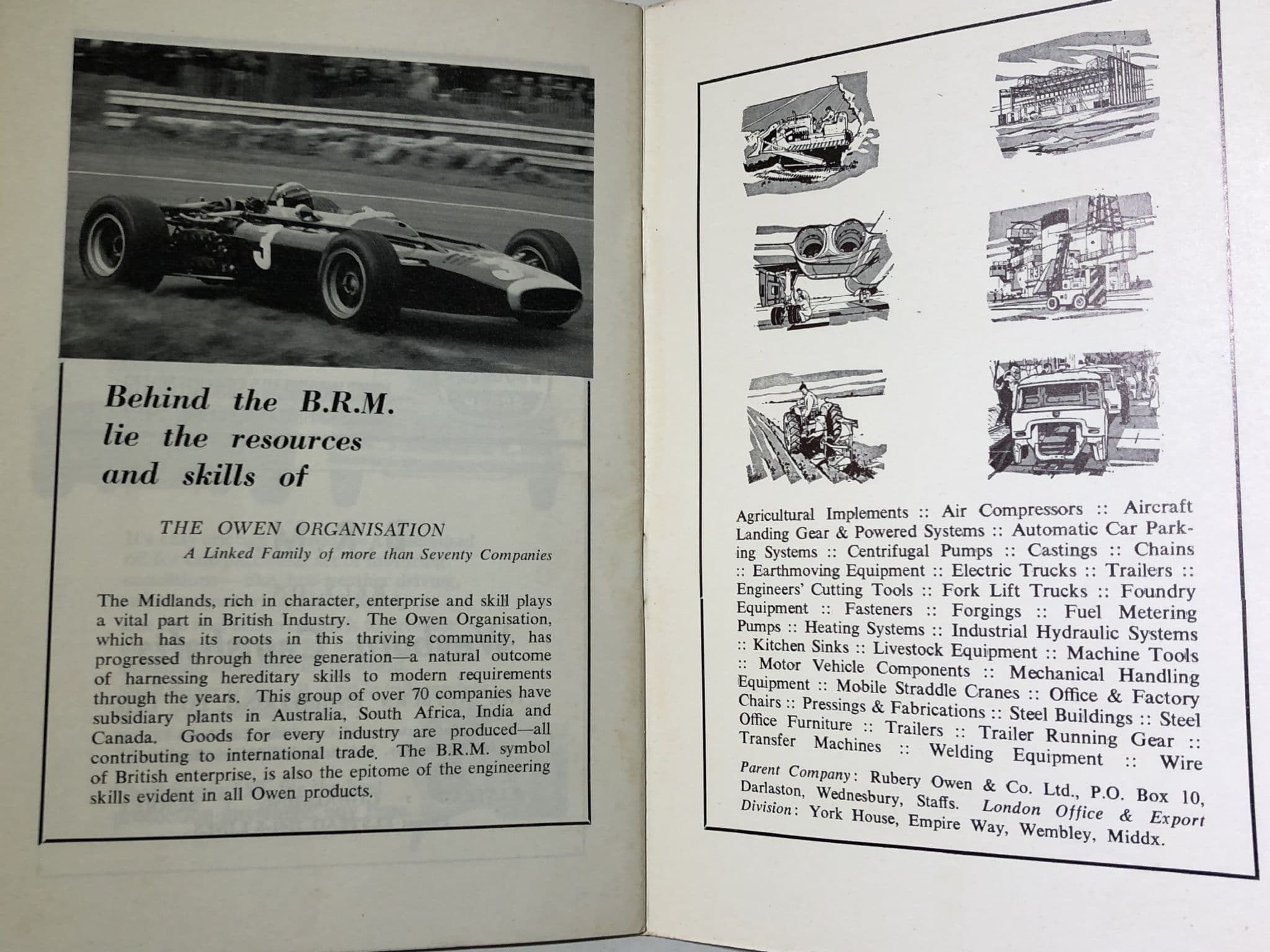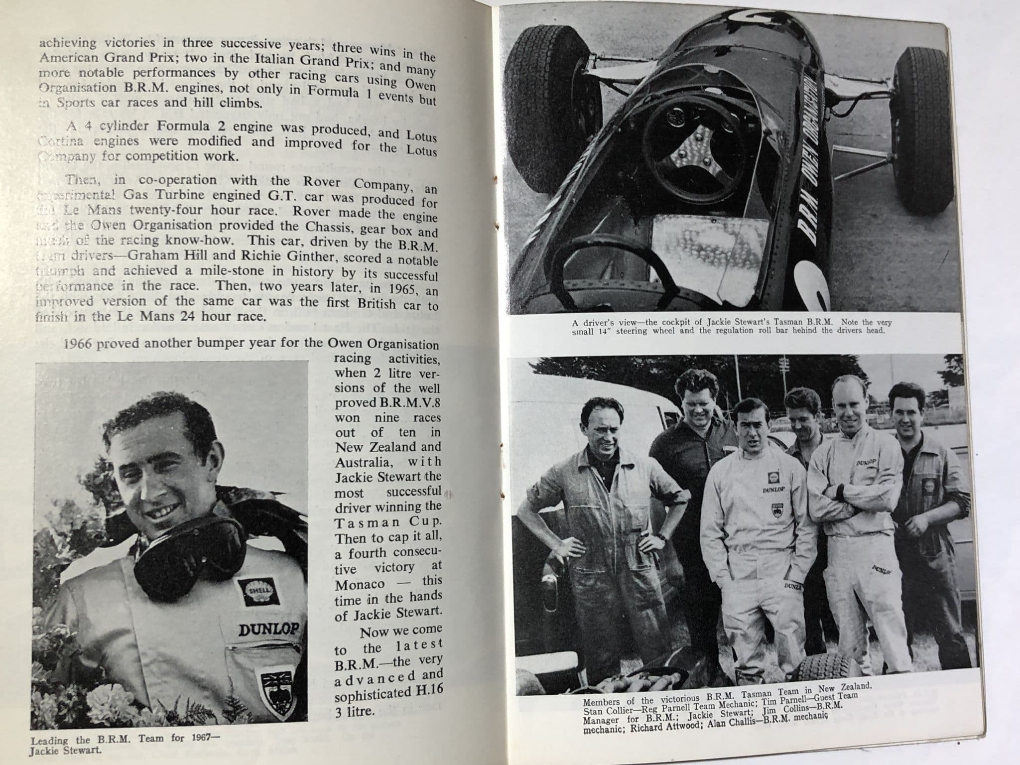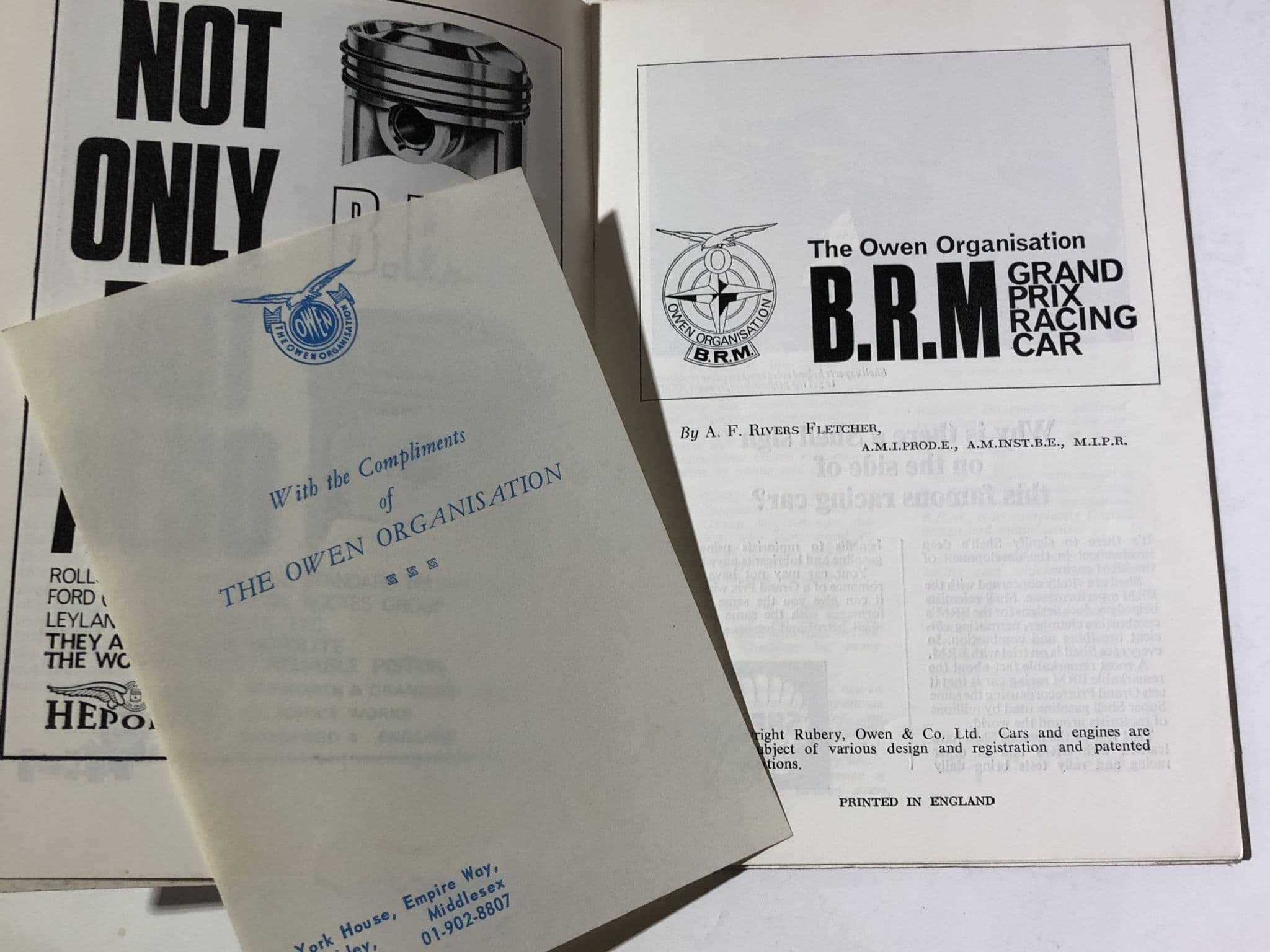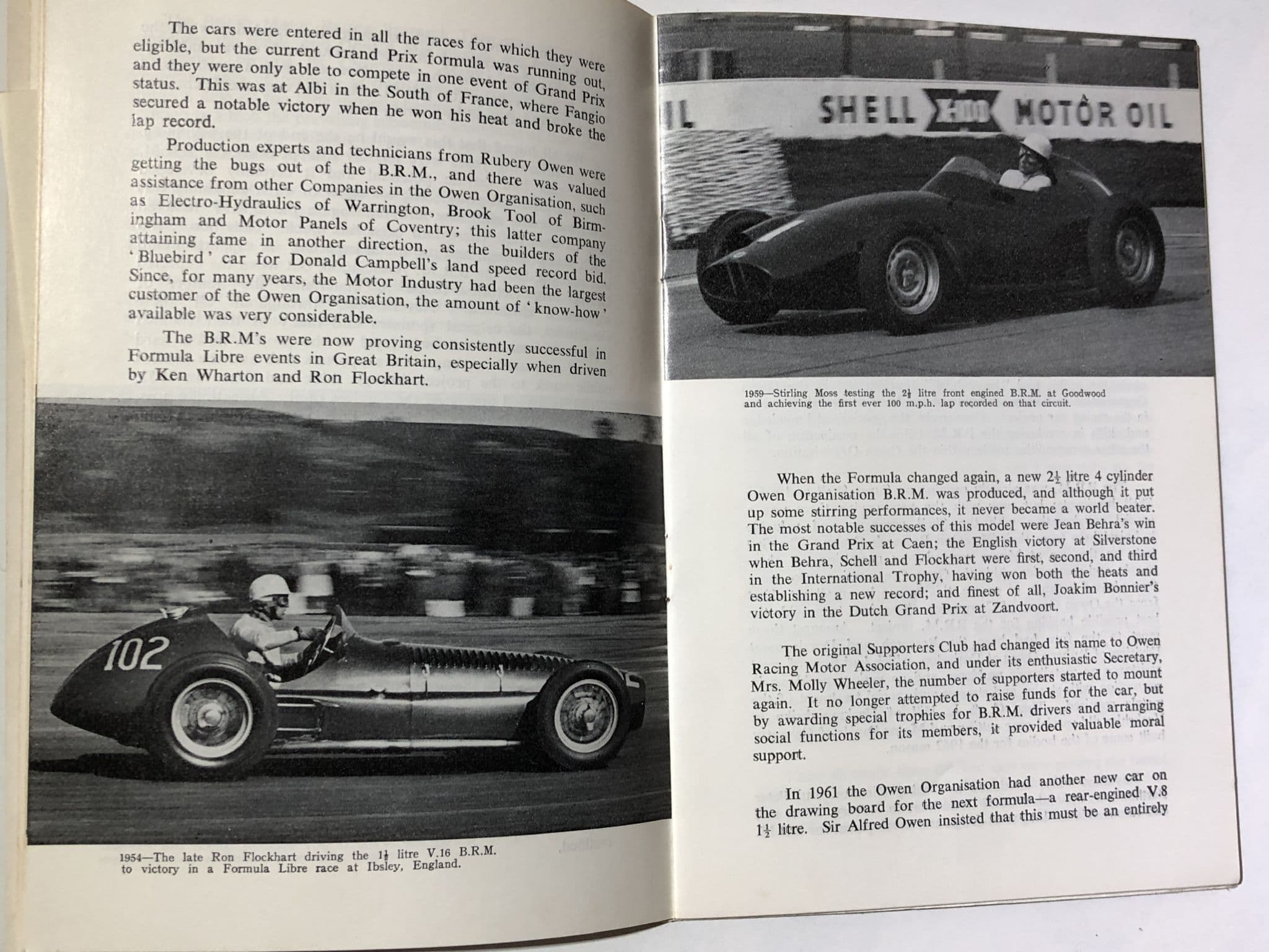 Booklet on the history of BRM in F1 , it's factory, team, and the arrival of the new V13 3 litre car in 1968 when the drivers were G. 36 pages. Includes a n original compliments slip from THE OWEN ORGANISATION who owned the team in it's successful years. Very good clean condition