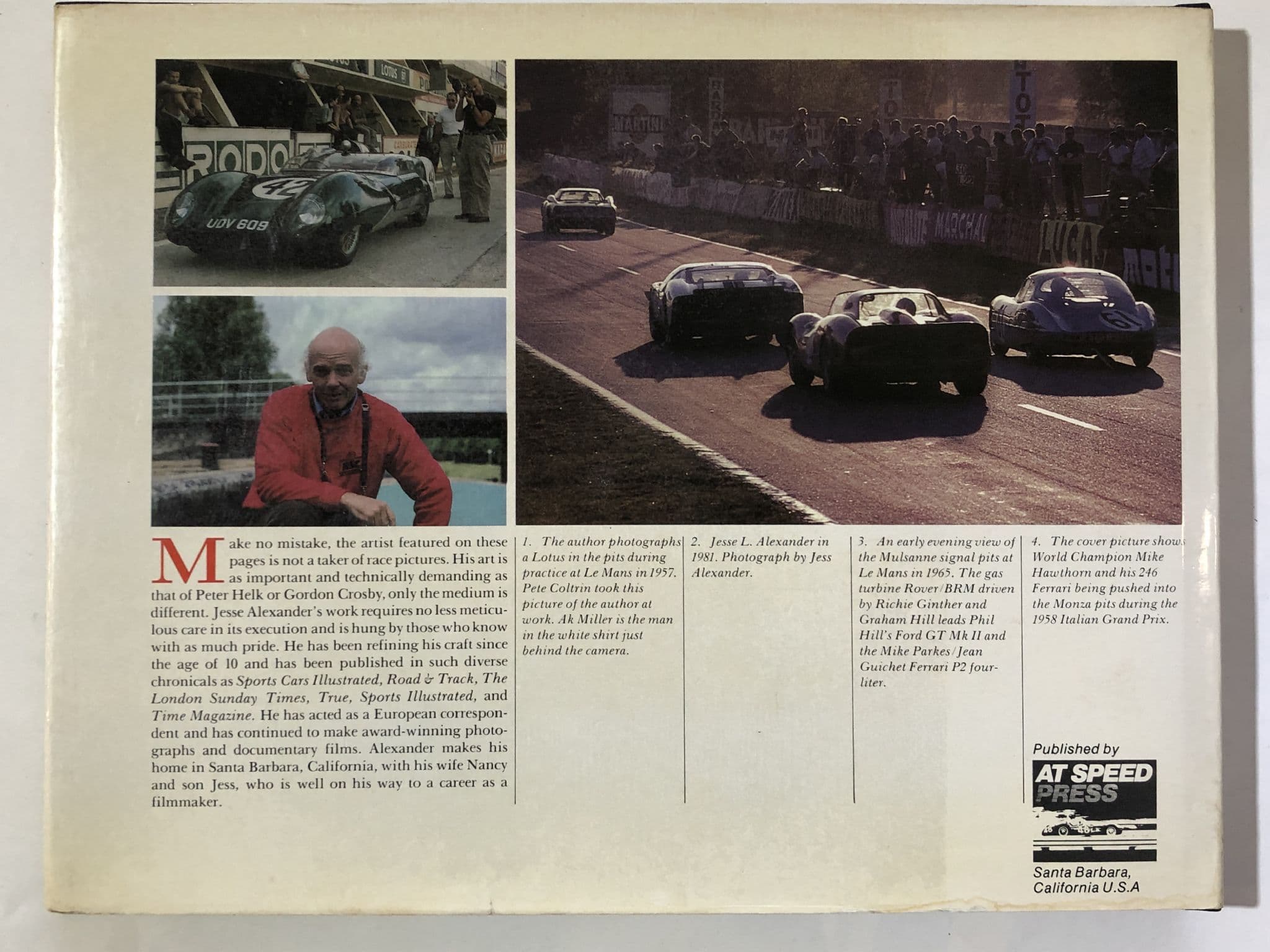 Through the '50's & early '60's Jesse Alexander followed the international motor racing scene and capturedtmoments of victory and despair and all that falls in between. Not just in the Grand Prix Cars but the Sports Racers  at the Targa Florio, LeMans etc. in the era of Moss, Hawthorn, Shelby, Hill, Clark and Gurney. A wonderful volume. 160 pages. The book is in very good condition  but the jacket has some mild  sun fading to the spine
