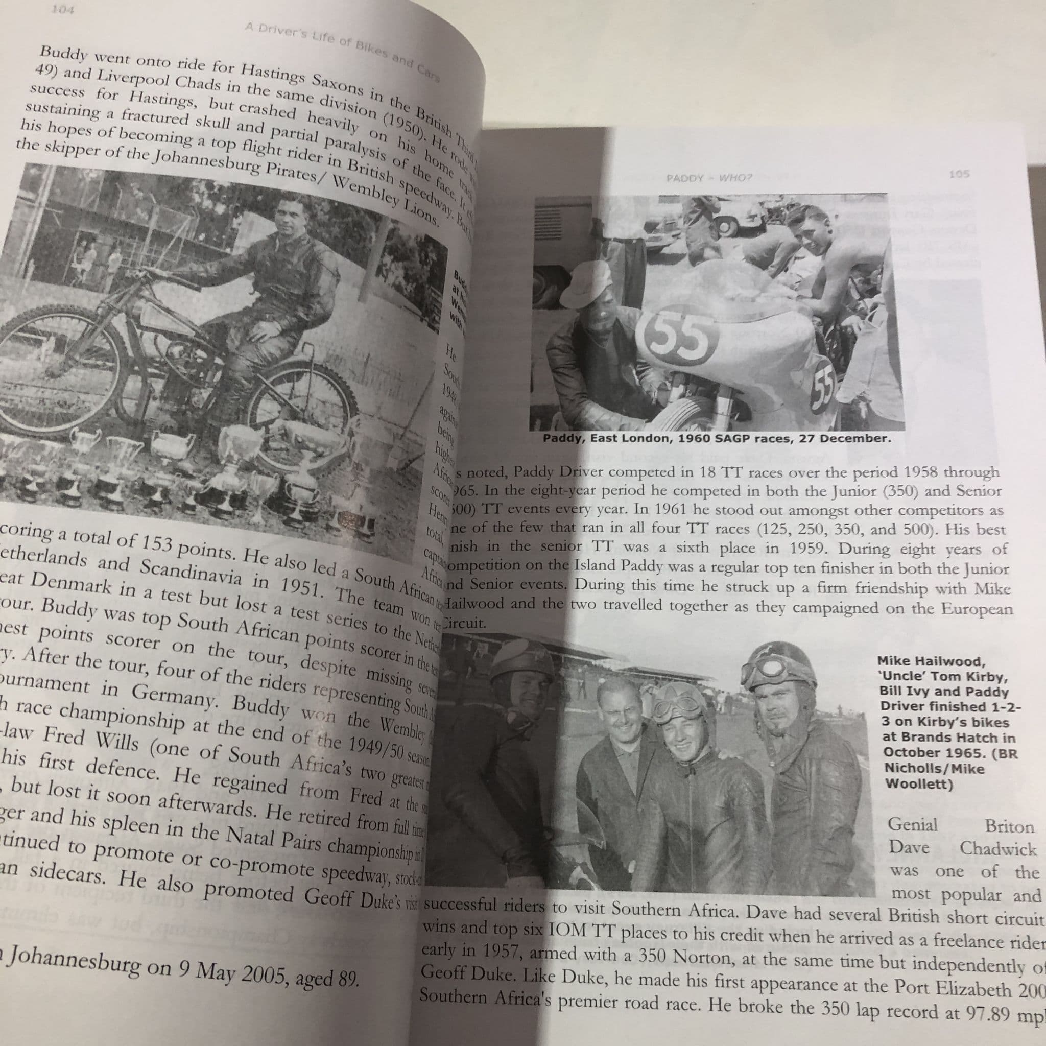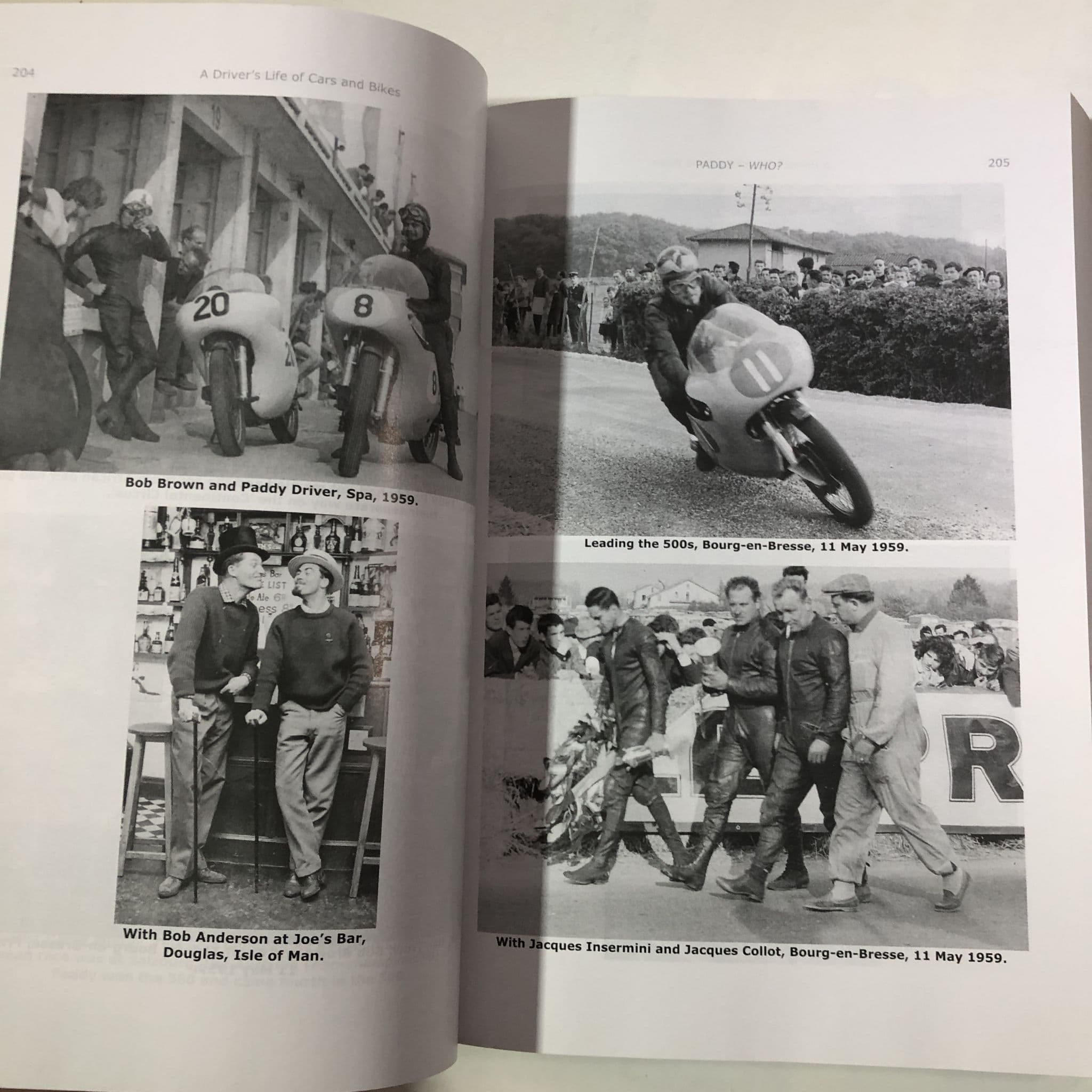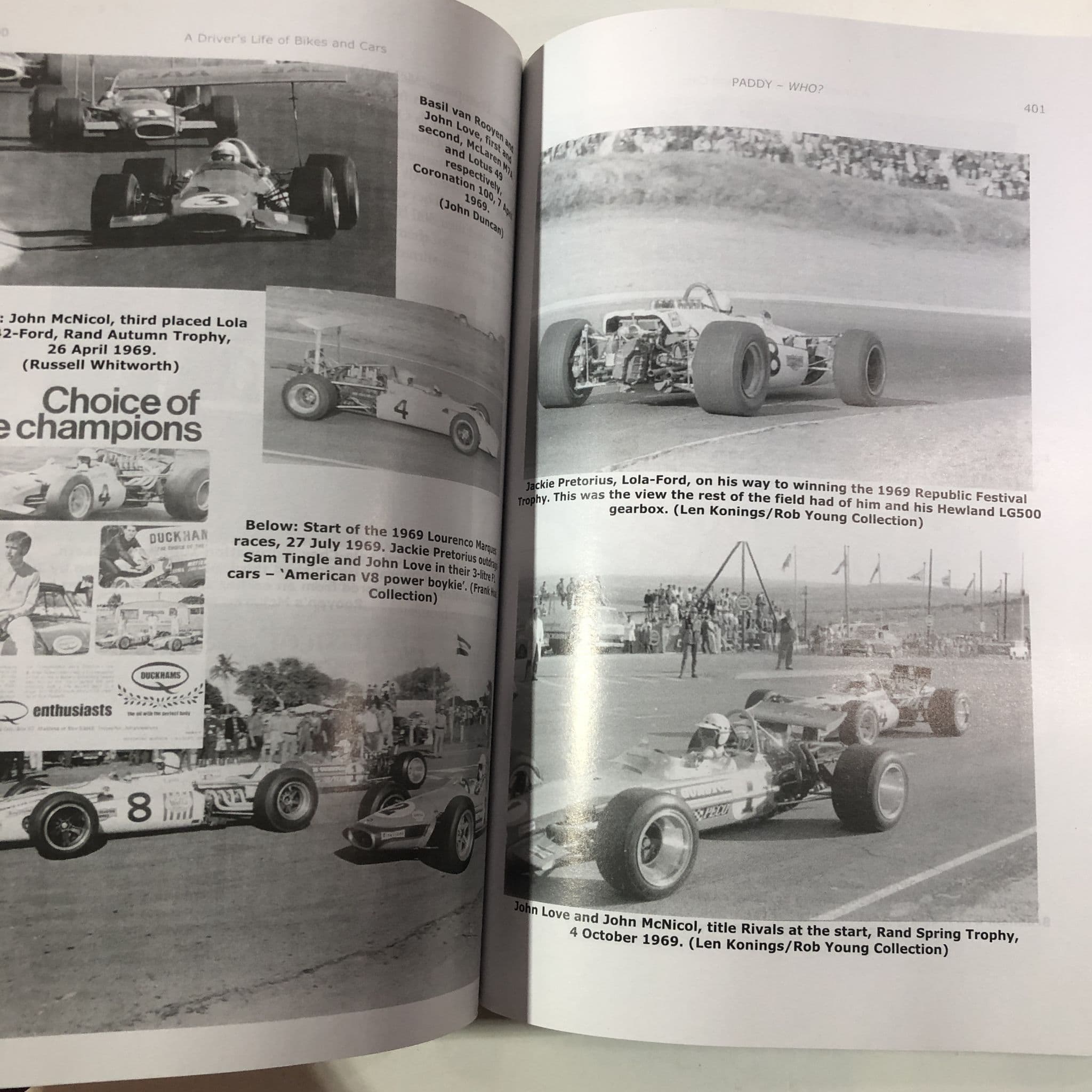The story of t South African racer Paddy Driver who moved from national event to racing in the 'continental circus' in Europe in the late 50s moving upward to Moto GP where he finished 3rd behind Hailwood and Agostini in the 1965 500cc world championship and then switched to cars and raced in the then popular South African F1 series, sports car, saloon and so forth , peaking with a drive in a Lotus 72 in the 1974 South African GP . His career went on into the 80s and this book is a huge 800 page celebration of the man, his career(s) and memories of and by those around him from Brian Redman and Kork Ballington to David Pioper and Freddie Spencer. The book is a thick, heavy softback and hundreds of photos, reproduced newspaper headline, track maps and other material. Very rare outside of South Africa and absolutely fascinating! Very good clean condition.