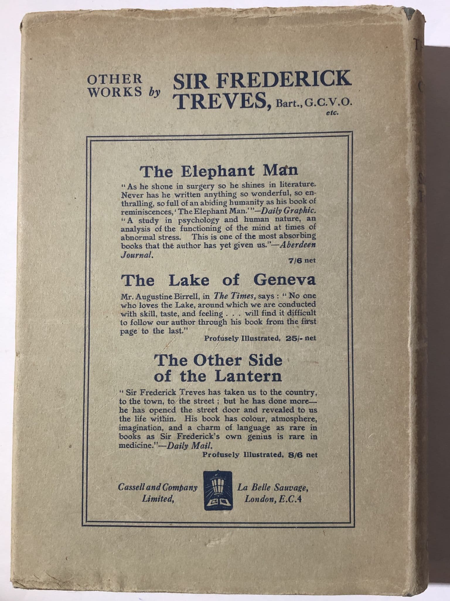 The author is most famous as the Victorian doctor who 'discovered' and treated THE ELEPHANT MAN , John Merrick, a story made famous in the Hollywood Movie starring Anthony Hopkins as Treves himself. 315 pages