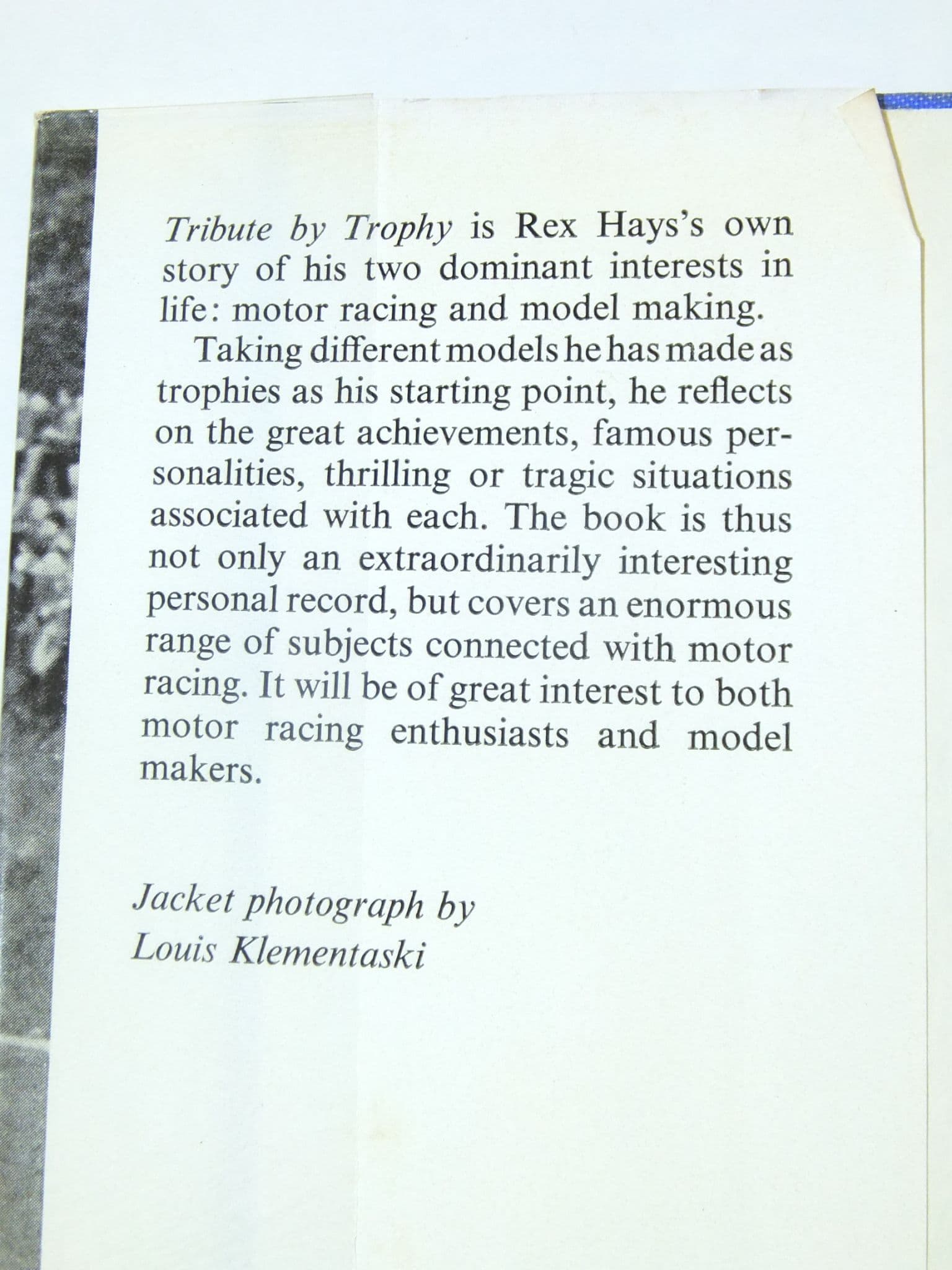Hays was the Gerald Wingrove of his day, the master scratch-model maker who's creations were habitually used by motor clubs as trophies at the time - hence the title. The most famous now is probably the POMEROY MEMORIAL fought for every spring in a unique event at Silverstone. This book tells the tale of each model from ERA to Bentley, how it was built, and what the original car stood for, did and how it related to the trophy he created in it's likeness. Most unusual book and hard to describe satisfactorily! Very good condition book and jacket with some edge and corner wear and a small hole on the back cover/spine/hinge area , 165 pages