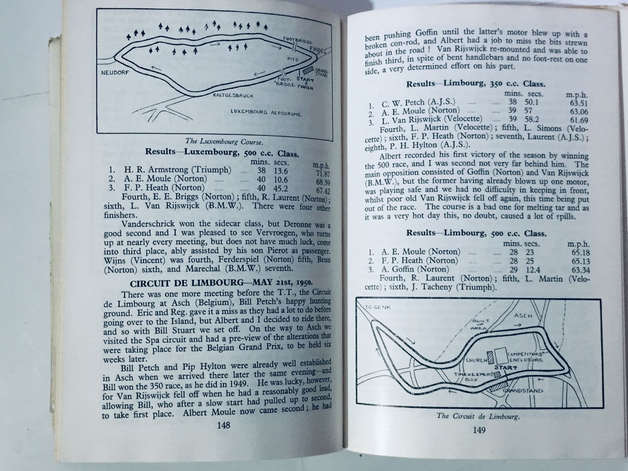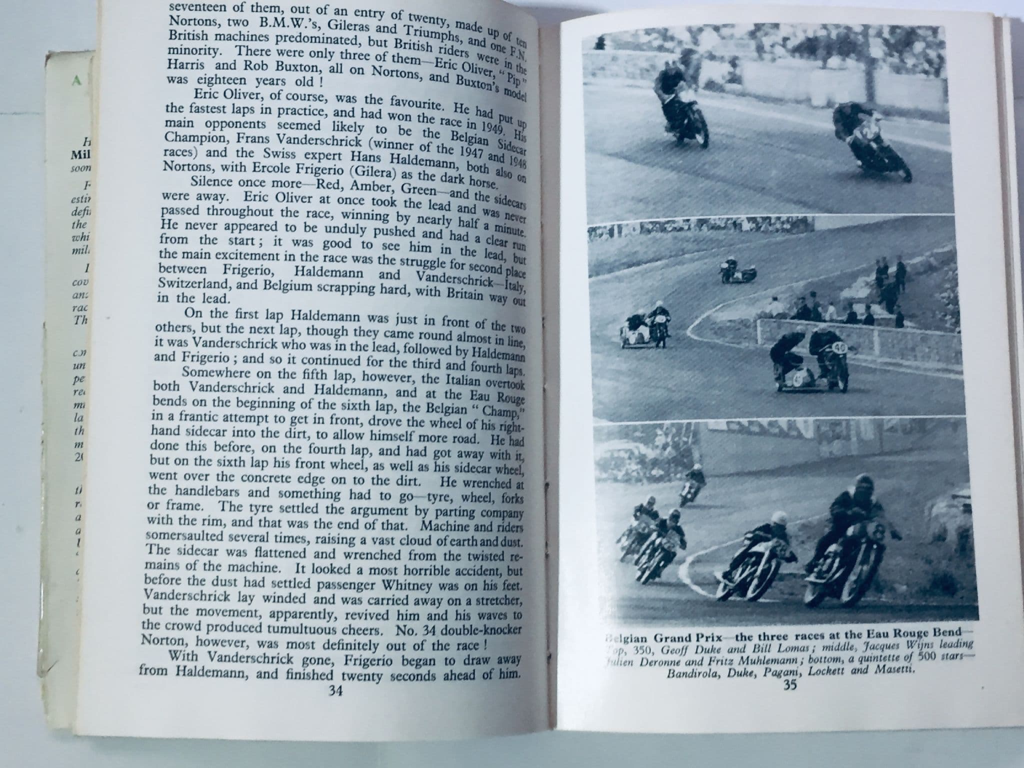 One of many books on motorcycle racing issued by G S DAVISON around this time covering TT, Manx GP, Irish road racing, Moto GP (as it now is) and so forth. Lots of photos and track maps, from places like Tallaght, Mettet , the original very long Assen etc. Coverage of all the major races of 1950 ,