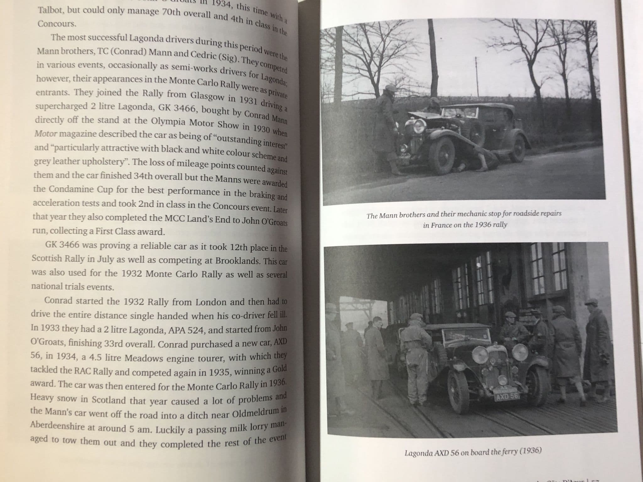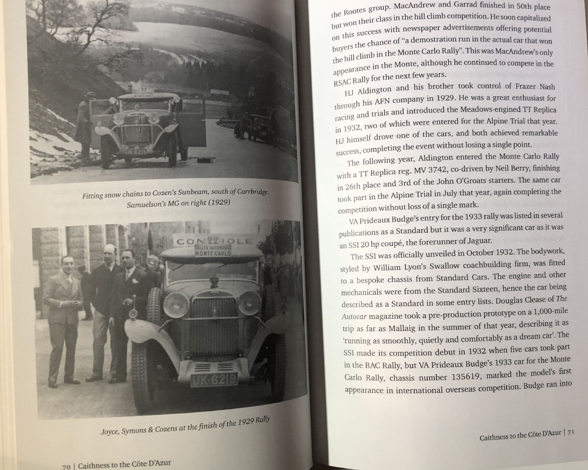 RECOUNTING THER ERA FROM 1926-1939 when the famous Monte Carlo Rally in mid winter started from (among other far flung locations) the furthest tip of northern Scotland. This was an era of high adventure on the event, of very posh cars (Lagonda, Bentley, Sunbeam etc) , very posh people (Lord de Clifford, Prince Narischkine, etc) and a lot of media attention.  135 pages, nice photos, a grander era and event than today! Very good clean smart softback.