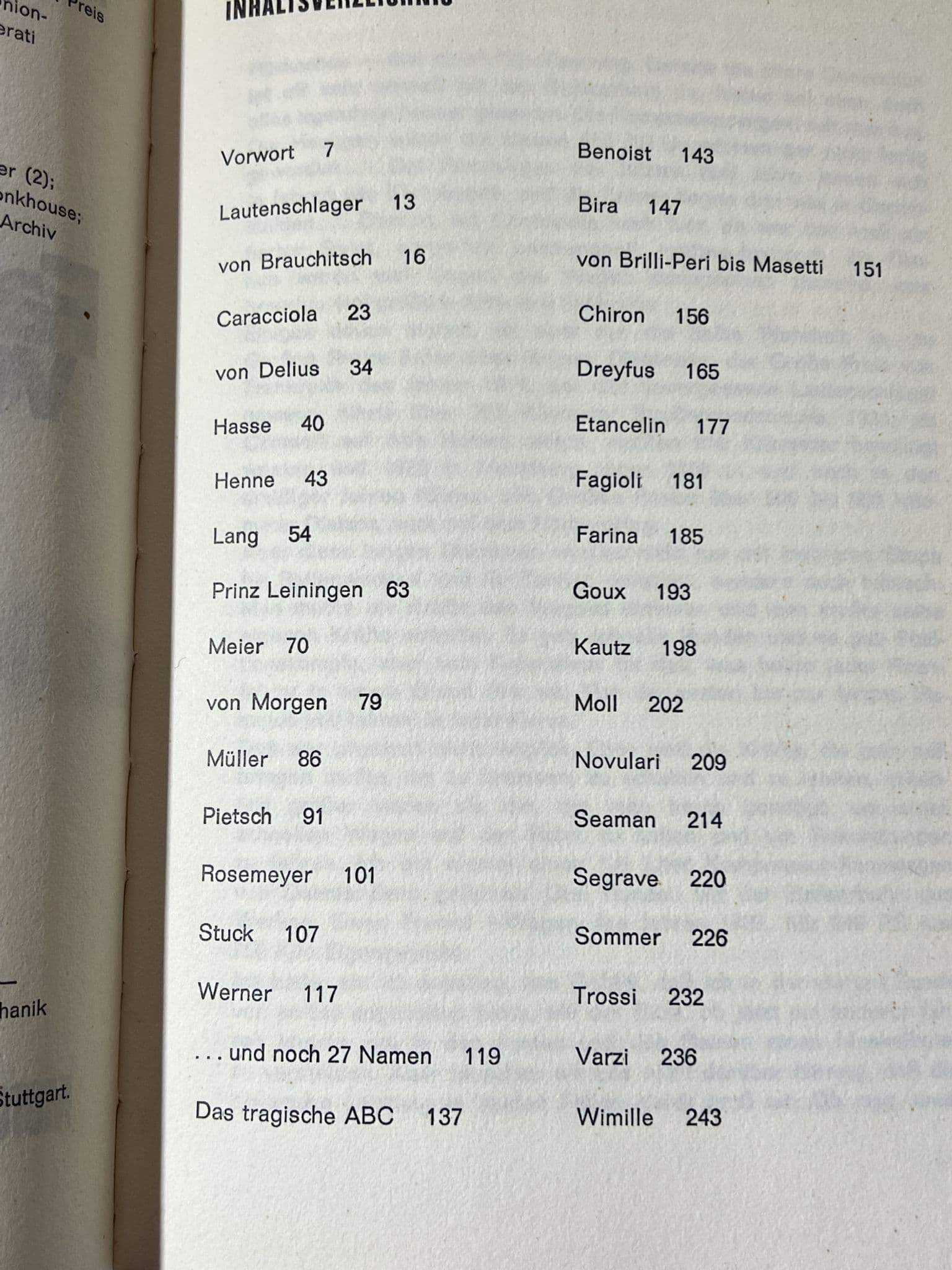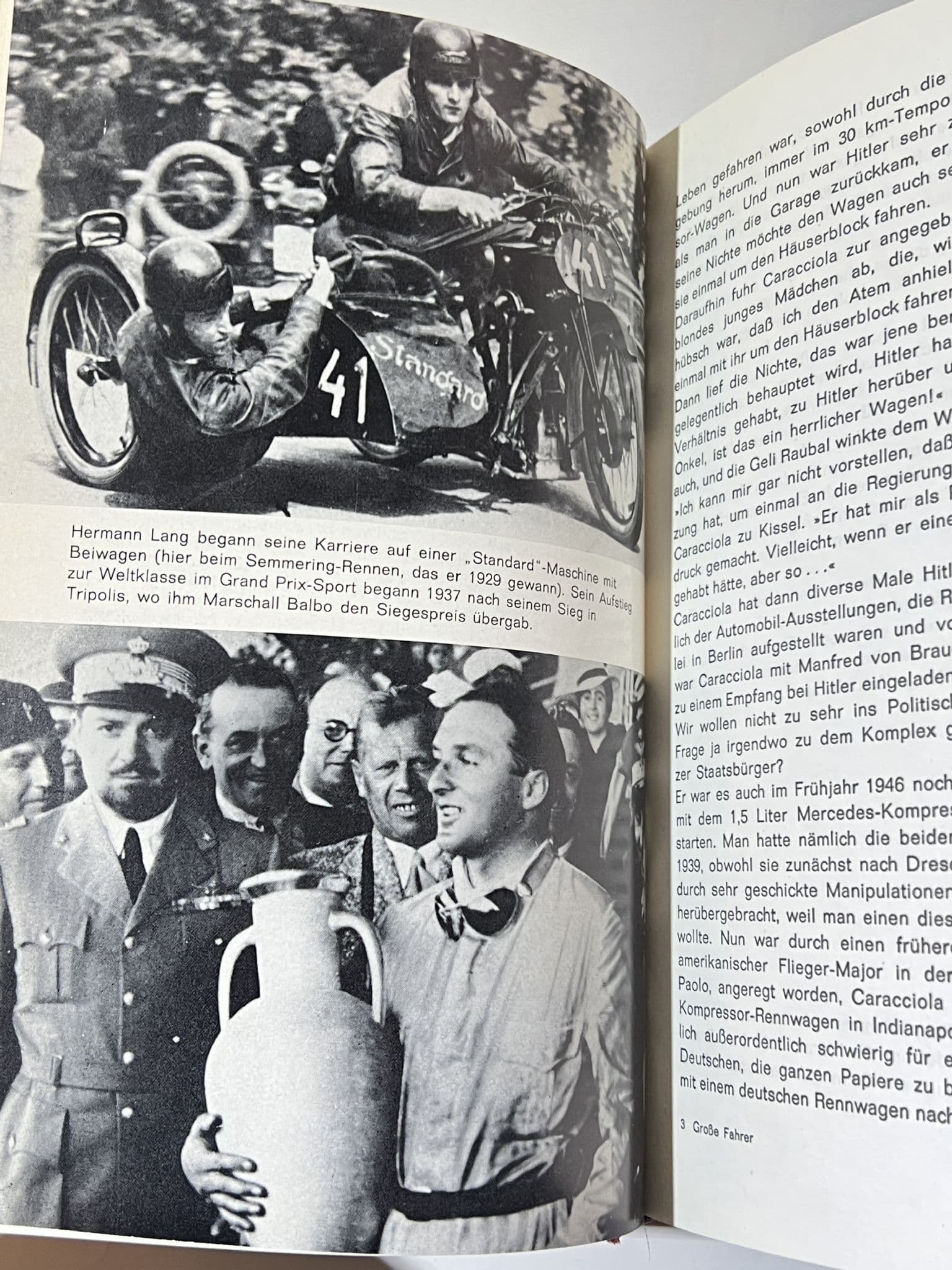 German book whose title translates to THE GREATEST DRIVERS OF YESTERDAY and each chapter profiles those drivers who's careers were at their peak pre 1950 , so you have the inevtiable Caracciola and Rosemeyer (along with the other pre-eminent 'Silver Arrows' drivers) but also less familiar choices like Brilli-Peri, Fagioli, Trossi, Sommer and Bira. . It's a sidestep from the normal 'great drivers' selection and all the more interesting as a result. a lot of unfamiliar photos used, which is always a bonus. Very good clean condition. book, the jacket has some edge wear and a couple of repaired splits along the top and bottom edges