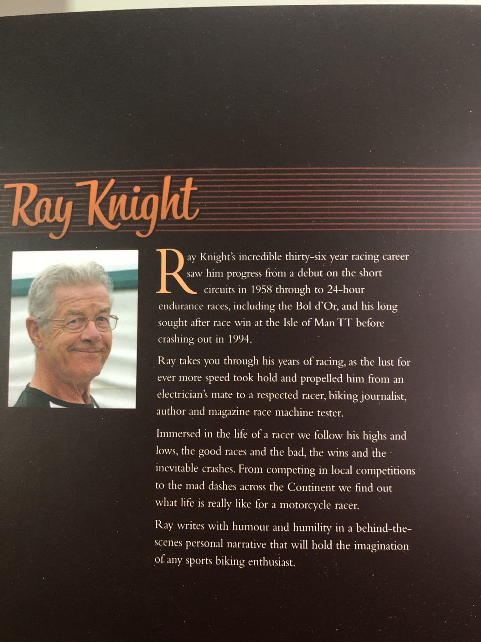 Ray Knight raced on the Isle of Man (and elsewhere) from the late 1950s to the mid 1990, some of those years as a works team rider, and among the bikes he rode were Trimuph , Honda, Dresda, Riyakl Enfield and Laverda. Great behind-the-scenes tales of struggles, accidents and success . 2009 softback 193 pahges. Quite a rare book nowadays. Fine clean condition