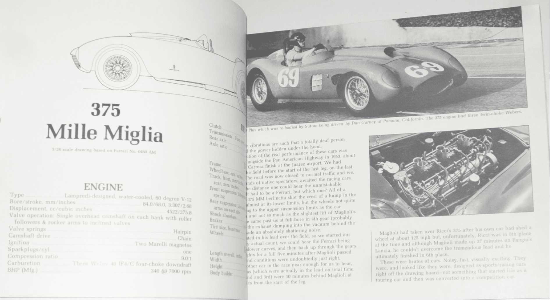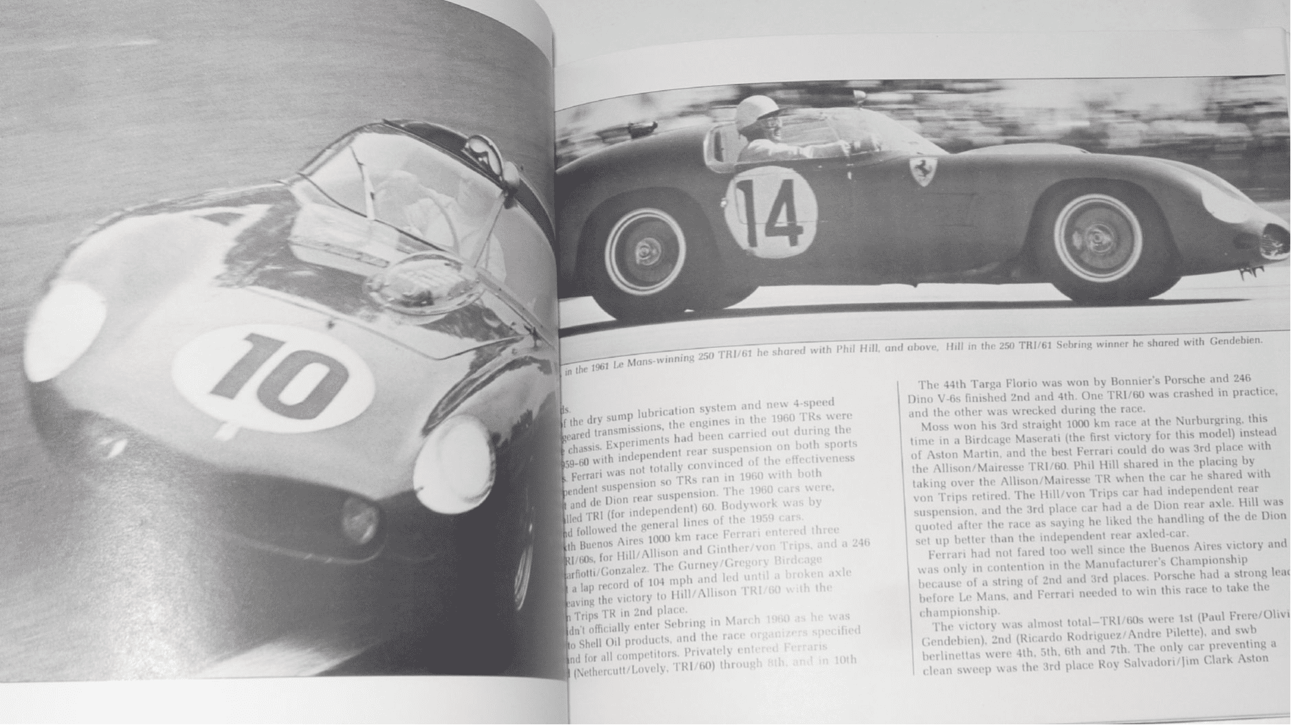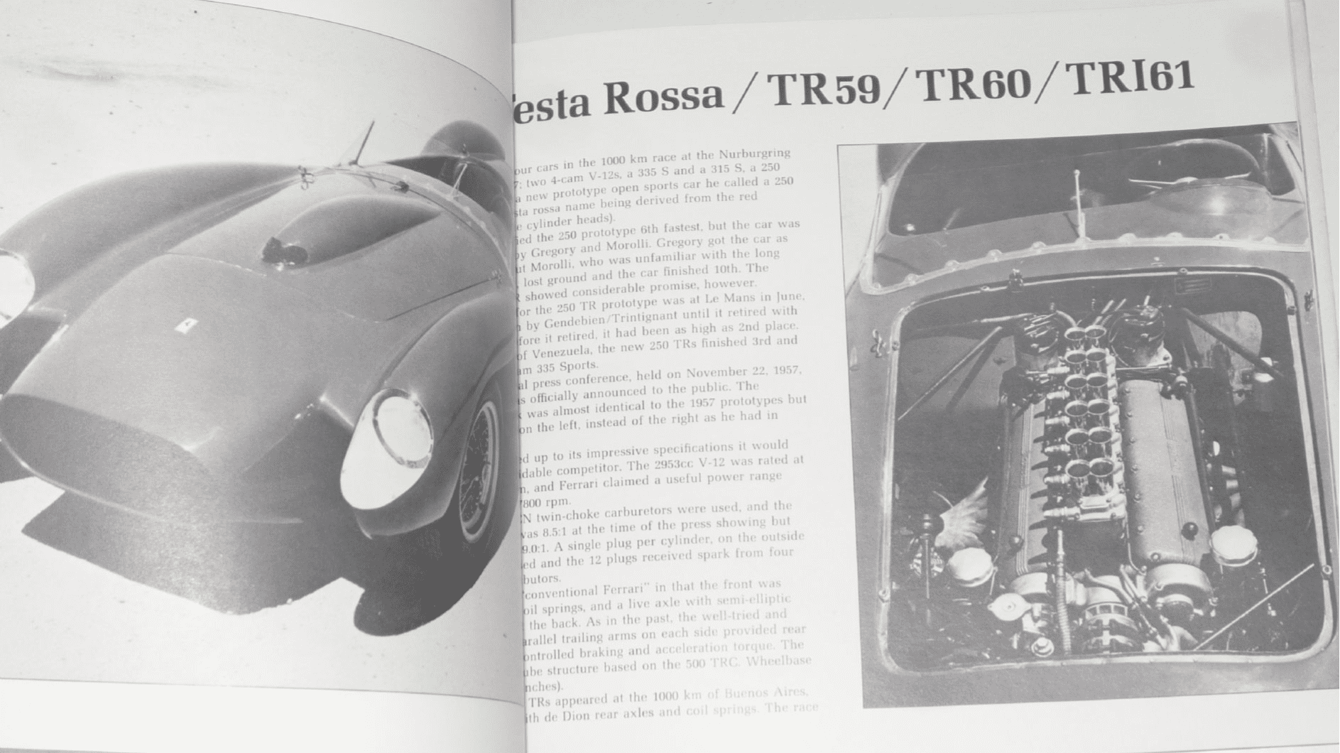 124 large pages model by model record of the open top front engined  Ferrari sports cars from 1940s  to the early 60s from 166 Barchetta to the later Testa Rossa variants. Lots of photos (all black and white) large landscape A4 size pages.. Good clean condition.