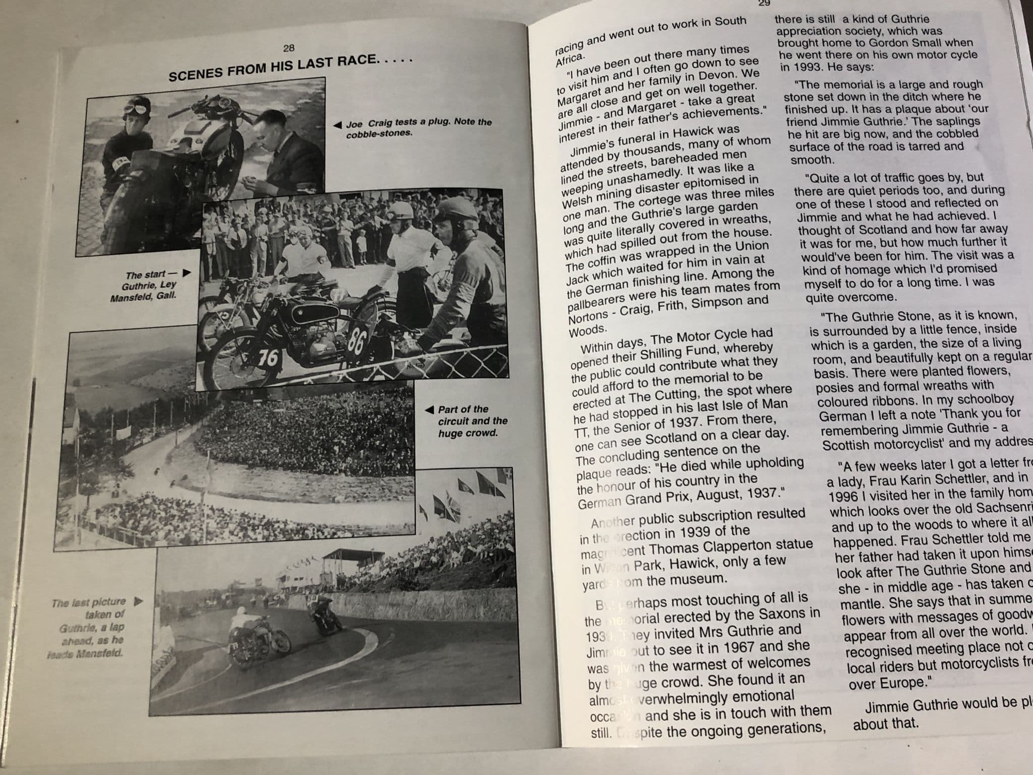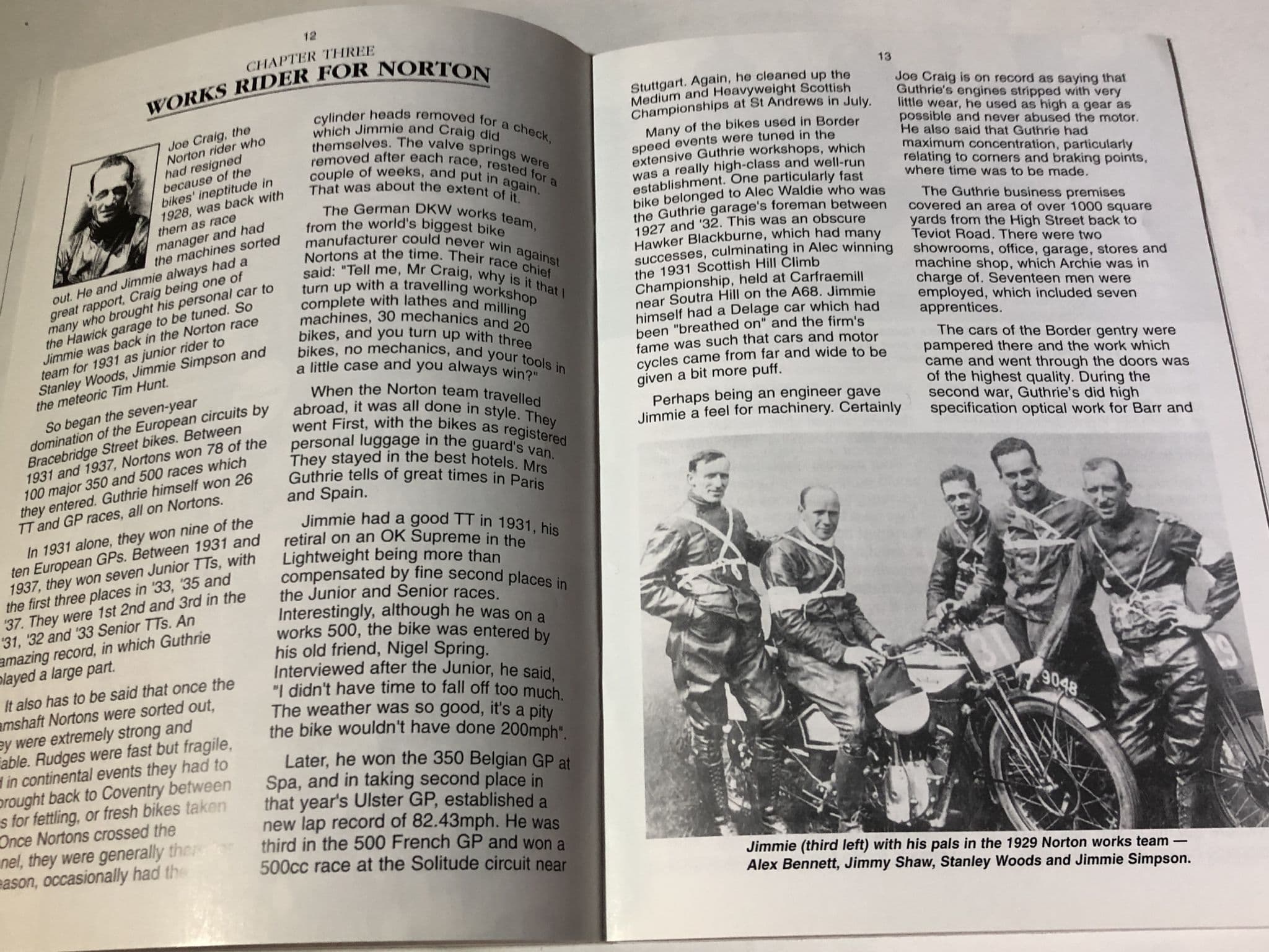 Small softback profile of the famous Scottish motorcycle racing hero ("The Guthrie Memorial" is a well known landmark on the Isle of Man TT course to this day) . Jimmie raced in the 20s and 30s, , won 19 Grands Prix including 6 Isle of Man TT races and stood on the podium of a great many more, was European 500 cjhampion for three years ion a row and a works rider for both Norton and AJs. Sadly he died whjile leading the 1937 German GP at the Sachsenring (a track that later claimed Bill Ivy's life) . Super little 30 page document with numerous photos on a real 'Local Hero' Very good condition
