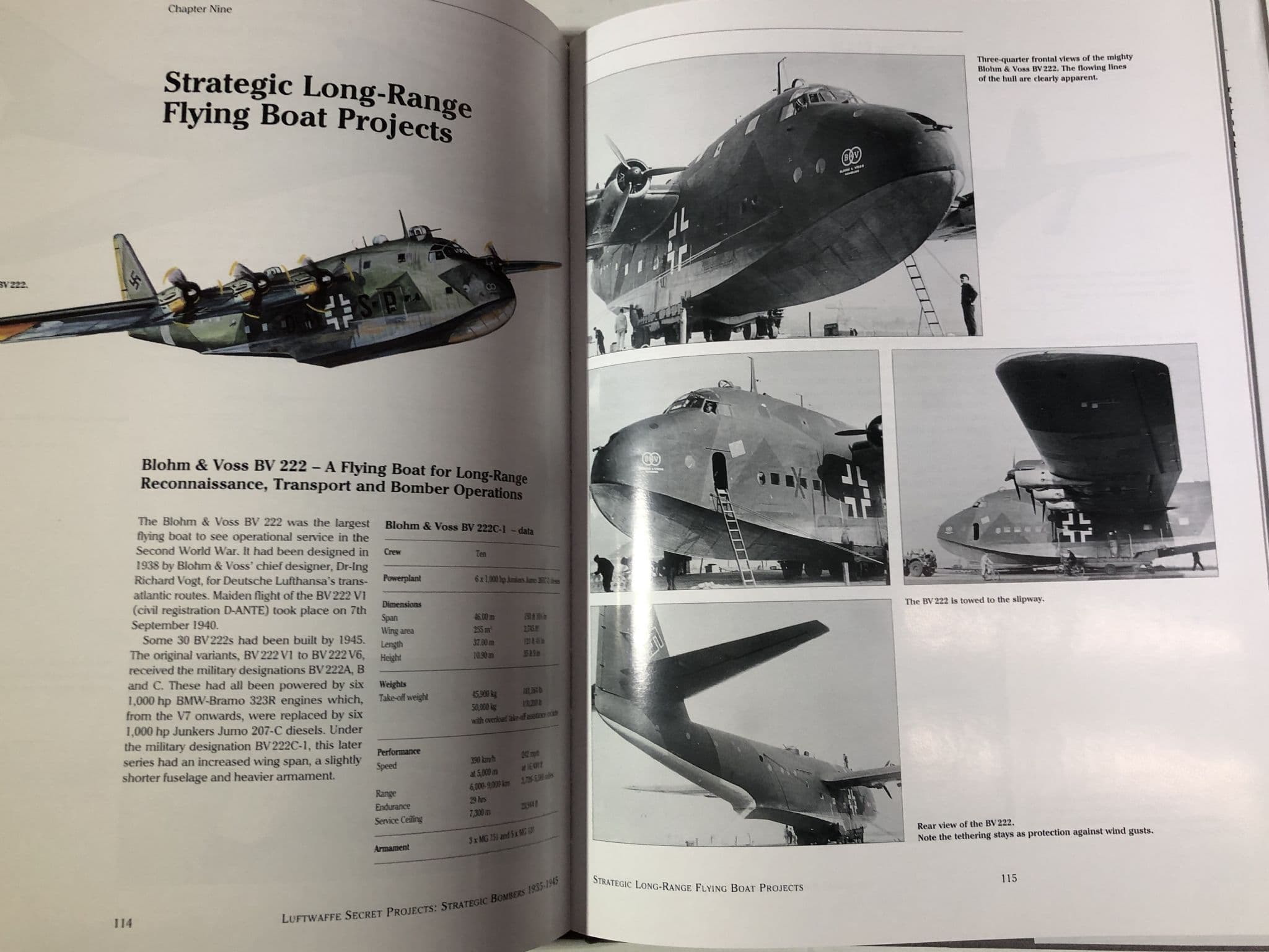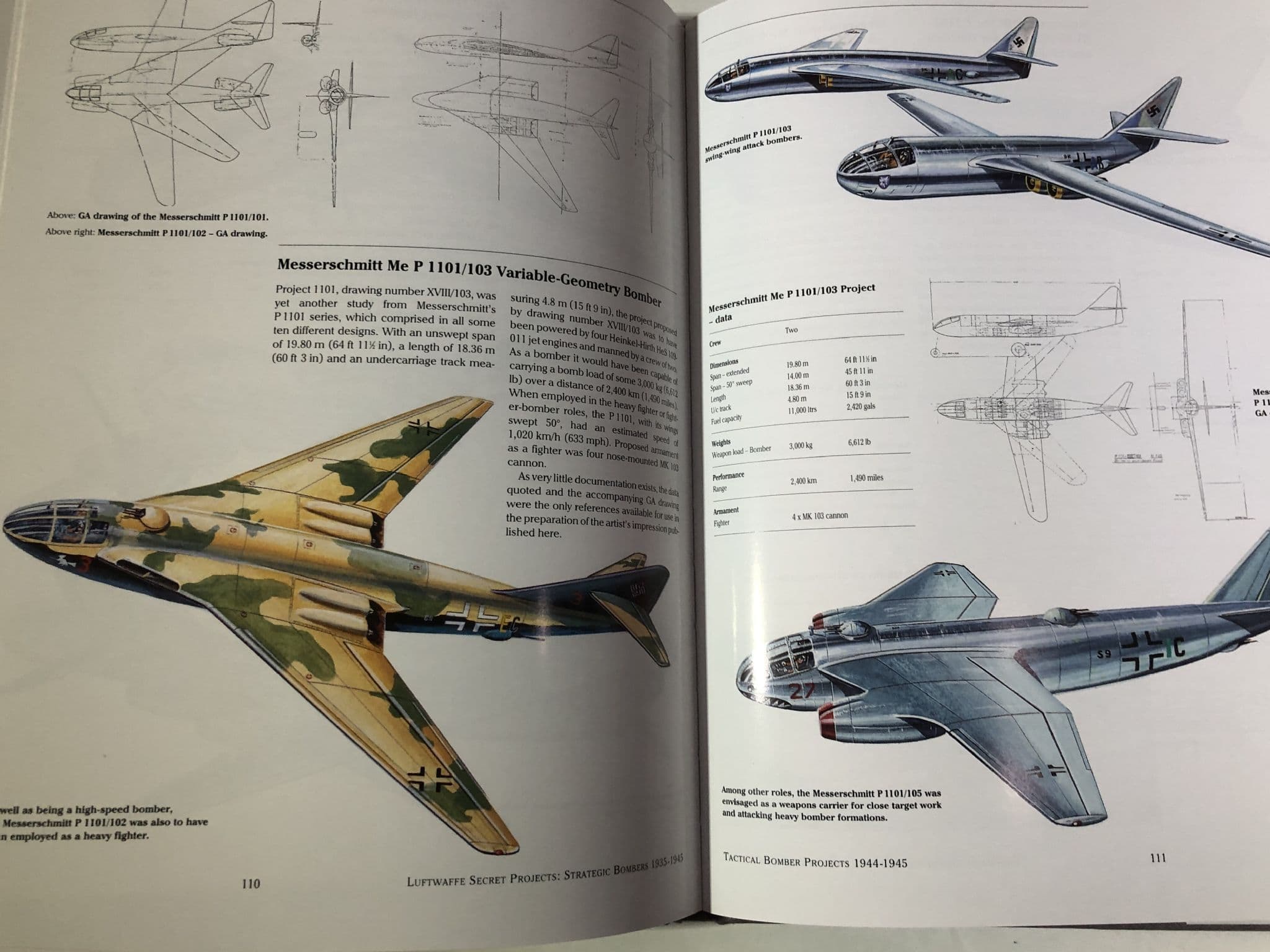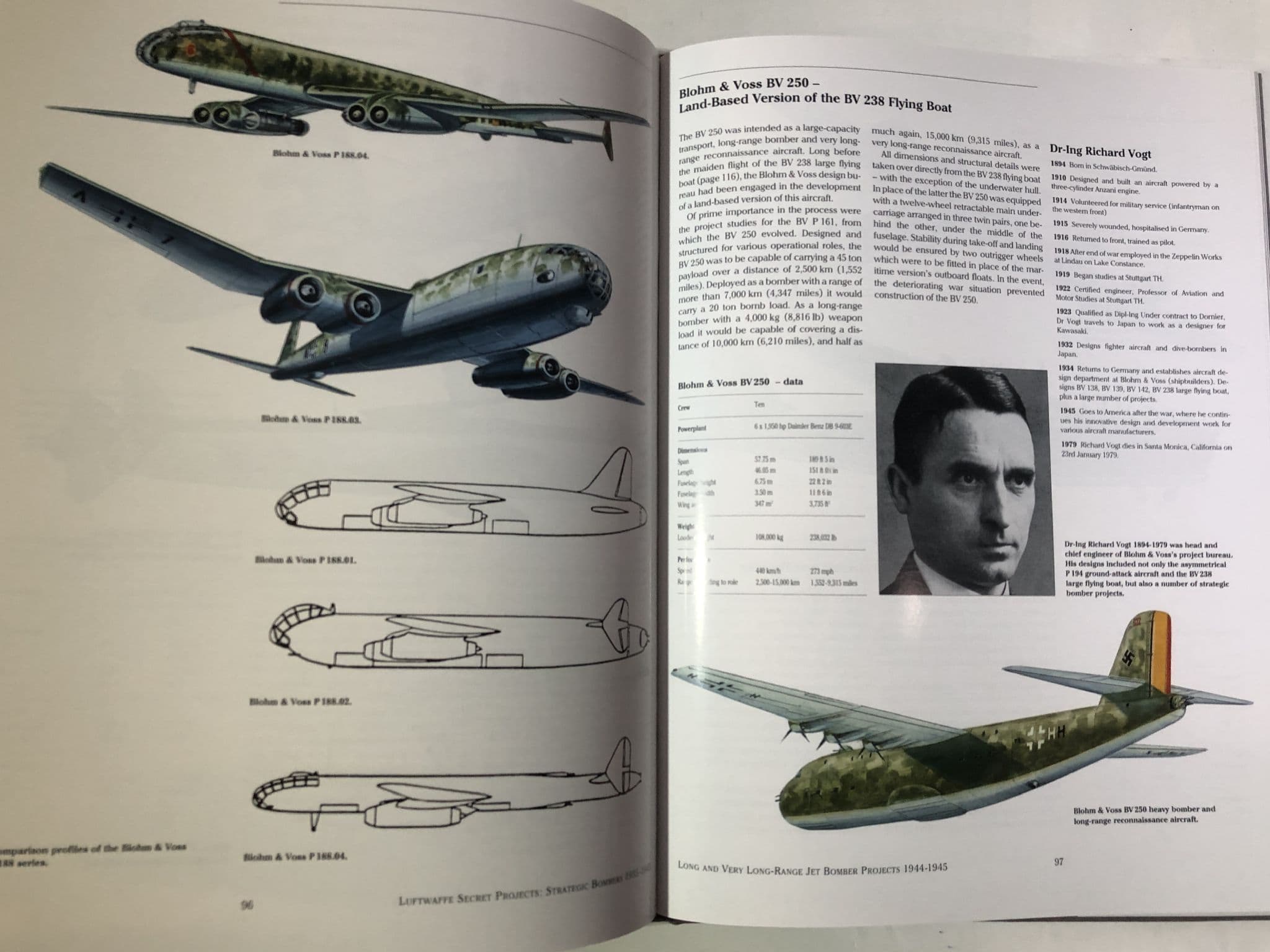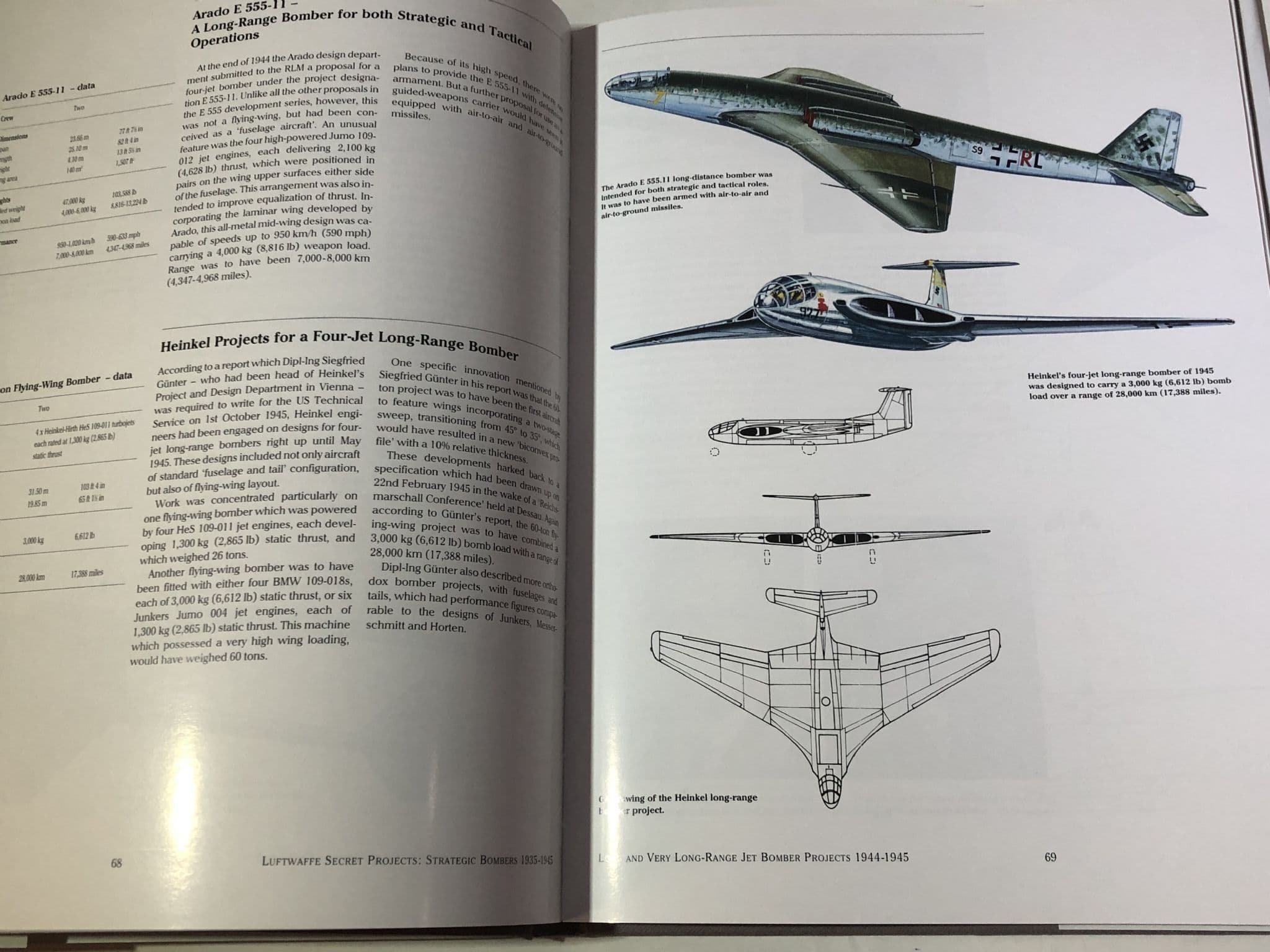 144 page hardback charting a succession of ever more elaborate and technically ambitious  aircraft planned and in some cases built and tested prior to the end of WW2 - mostly paper projects and plans, illustared by artwork and plans  but  the actual machines that were actually constructed are, where possible, shown in period photos so you have the 4 engined Dornier Do19 , canceled after over 80 test flights, the Junkers Ju390, cancelled in 1944 after a single prototype had flown and  the jet powered Ju287  flown in 1944 but still not cleared for production by the war's end. Fascinating stuff.  Very good condition book and jacket.