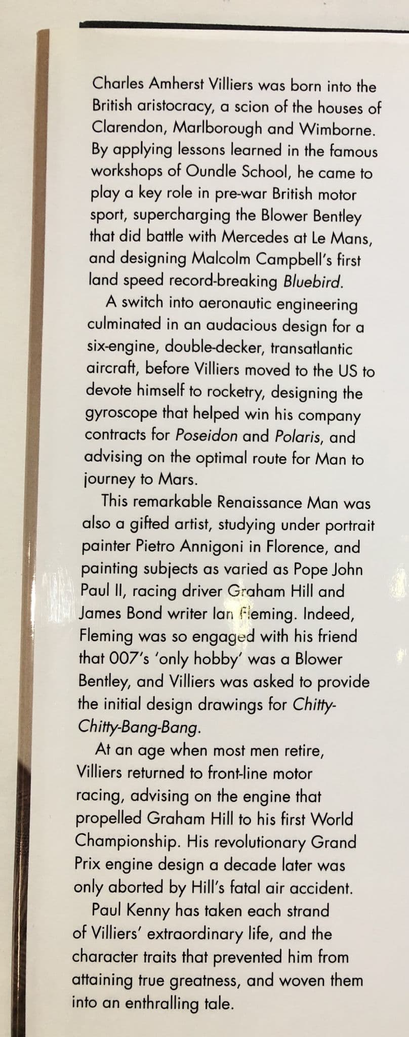 "The Extraordinary Story Of Charles Amhurst Villiers" There's a name to conjure with! Known to all Vintage Car enthusiasts as the man who put the 'Blower' into 'Bentley' and tuned Raymond Mays Bugatti and Vauxhall hillclimb cars in the 20s. This book however tells much more than perthaps most of us suspect. Yes, we know his work was an inspiration to author Ian Fleming and resulted in James Bond's passion for Vintage Blower Bentleys, but how many of us knew of his 20 years involvement with the US Space Programme and his paintings that hung in London's National Portrait Gallery. All this and much more in this fine 353 pages book of text and picture fill a long overdue gap in Motor Racing History. The book is in fine condition. the jacket is faded at and around the spine