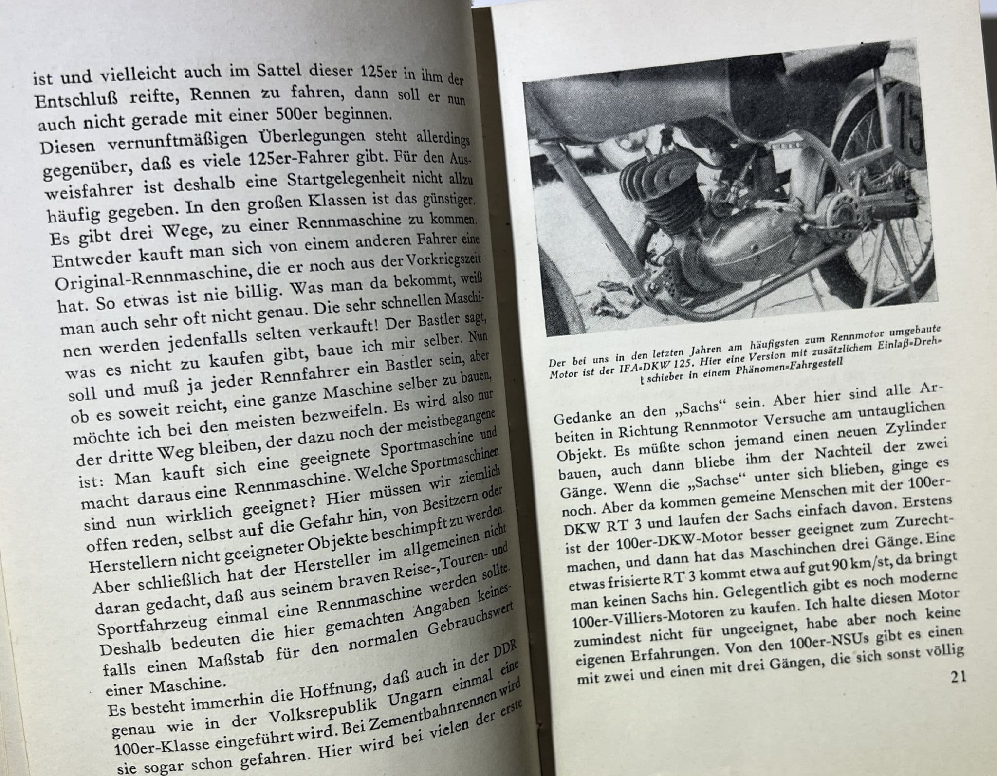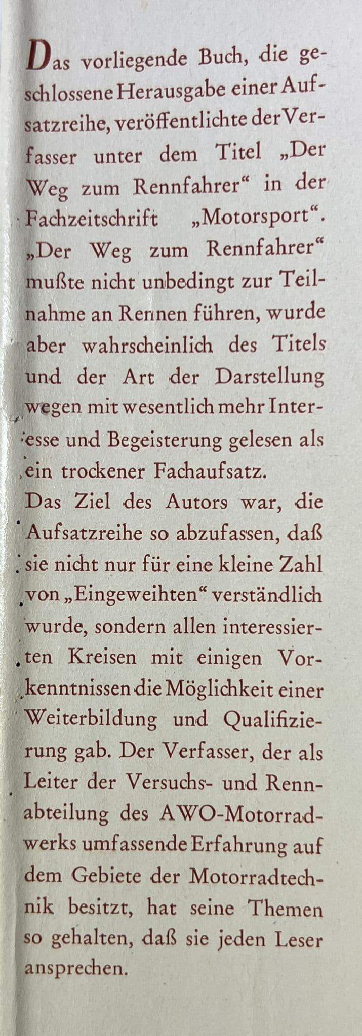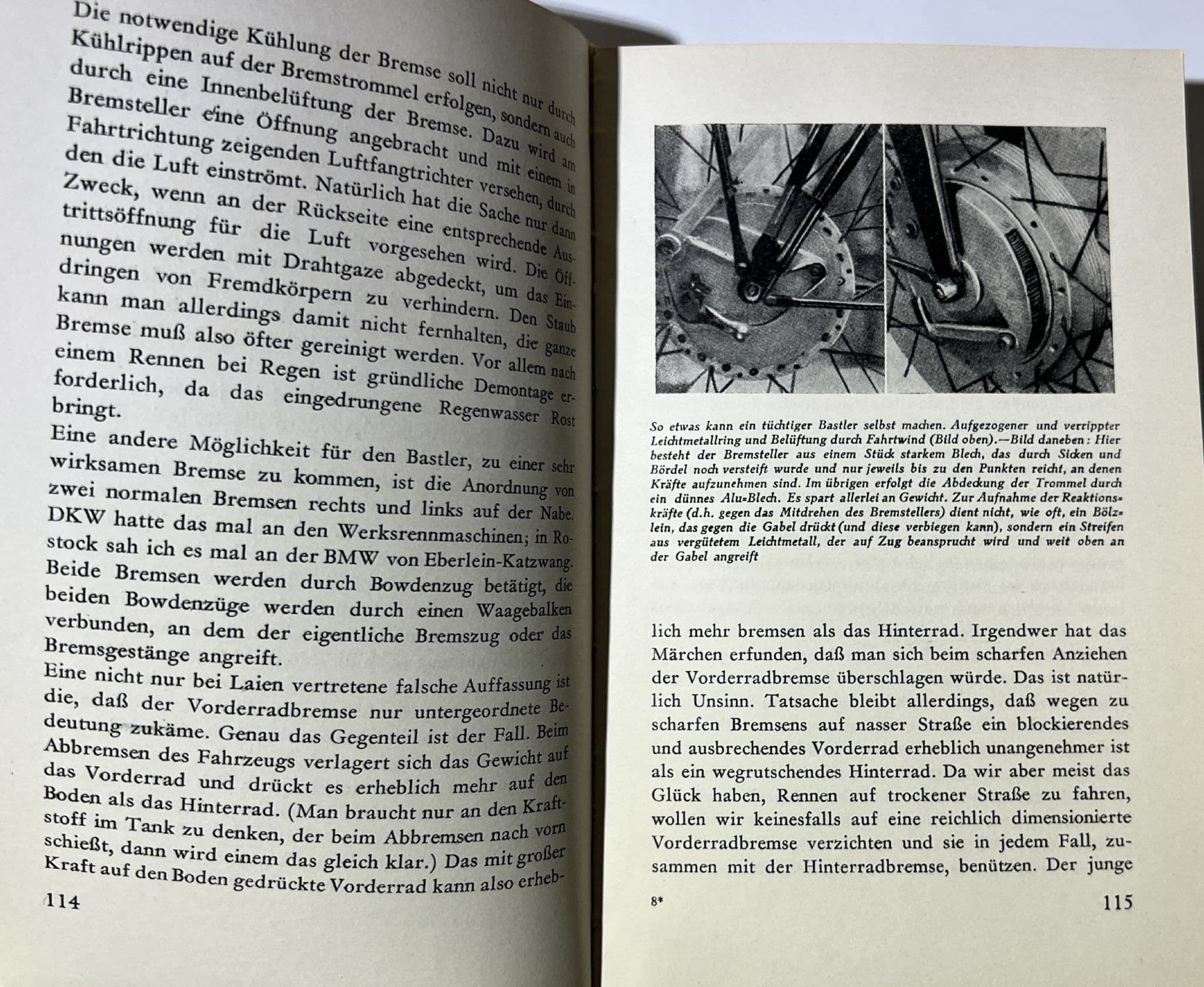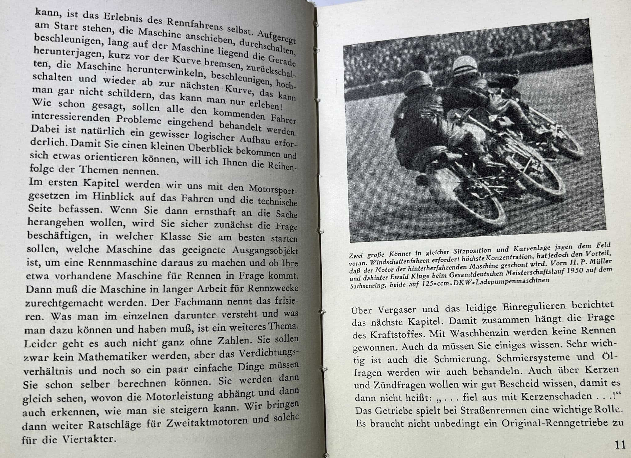 German published guide to the technology of motorcycle racing as it was in the early 1950s.Much data on tuning and race prepping your machine - all well out of date now of course but a charming period piece , 180 pages very good book and jacket (some edge wear)