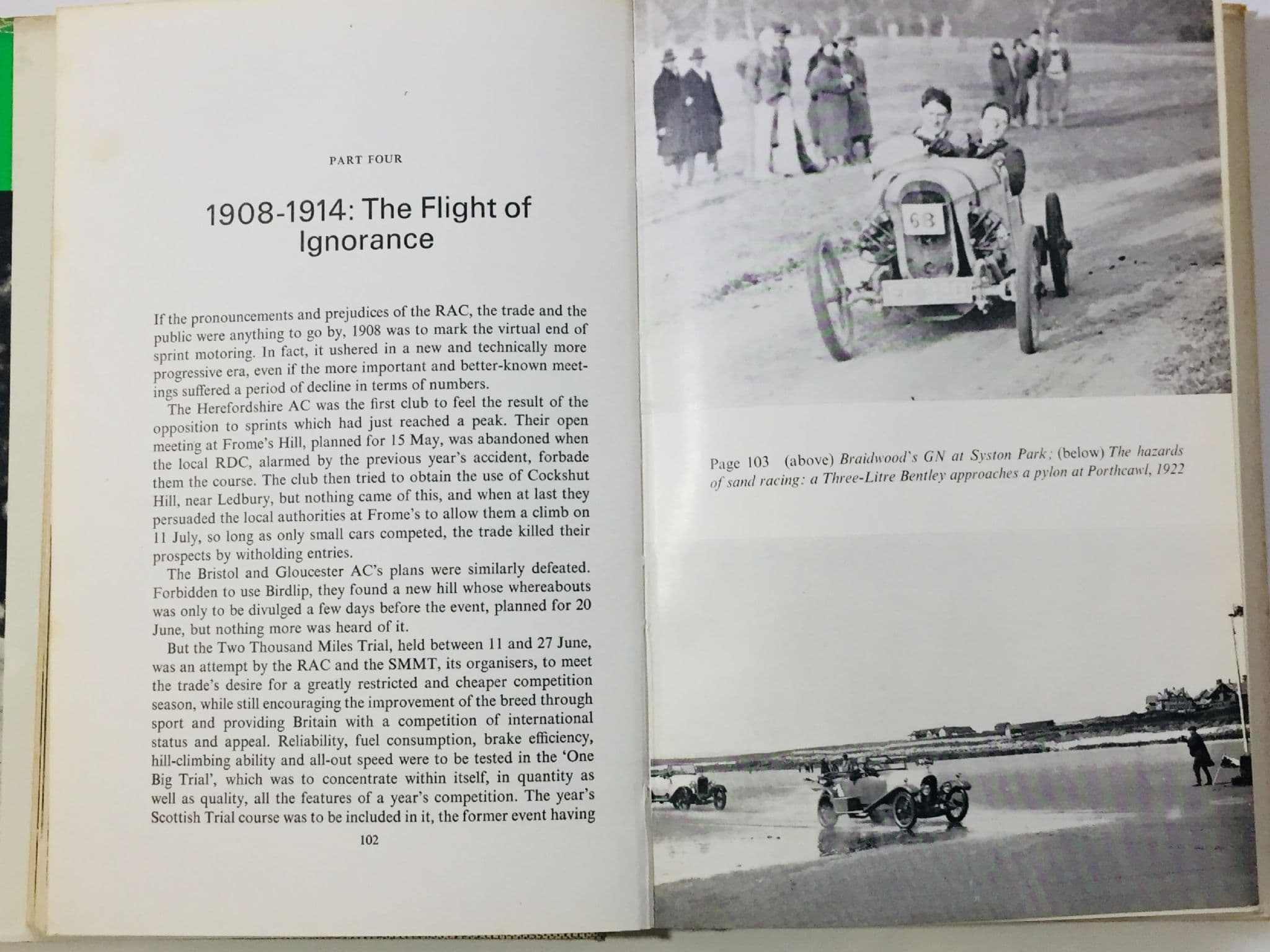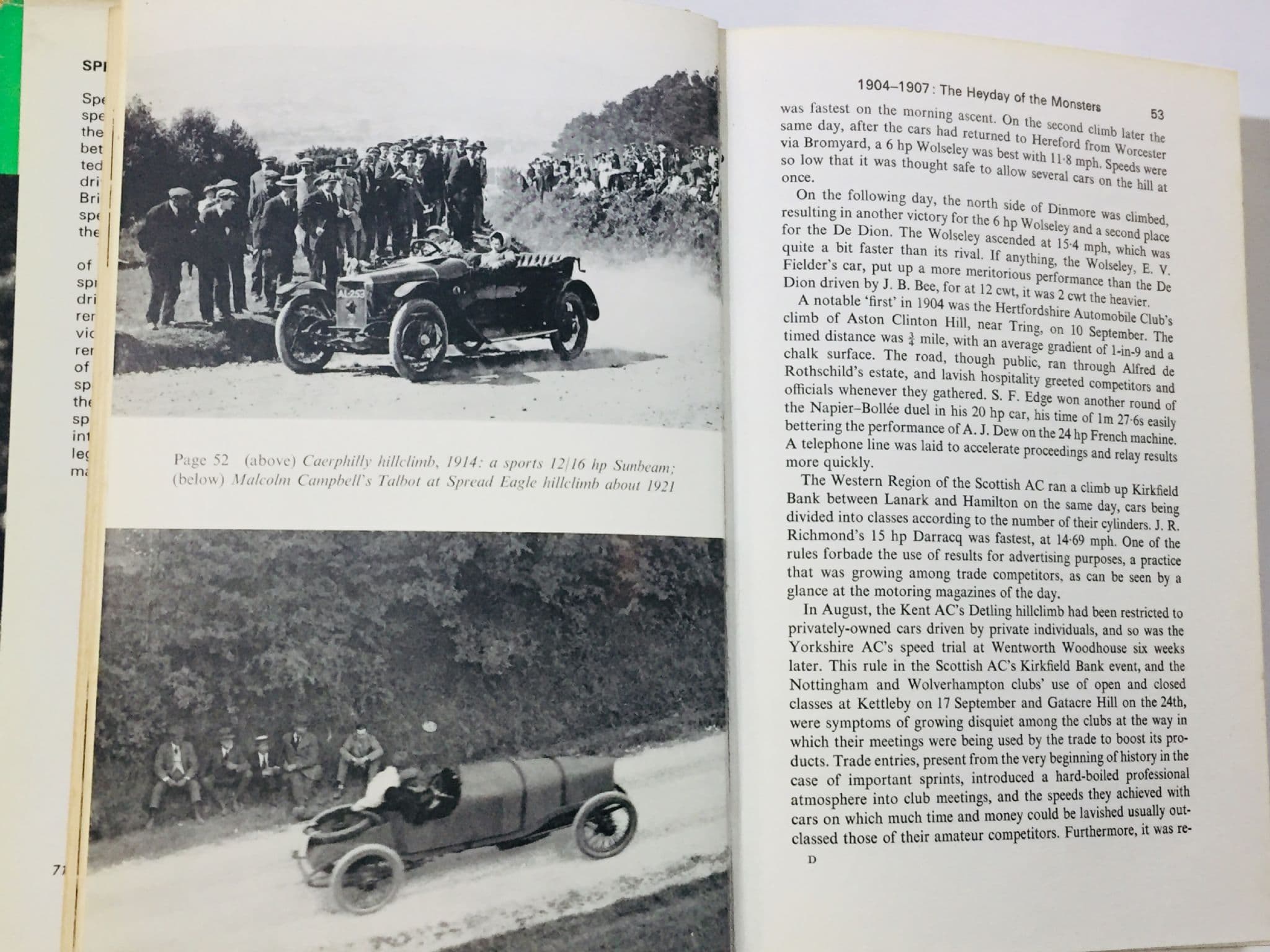 Unique book on the very British sport of Speed Hillclimbing and Speed Trials up to 1925 when most of them had been run on (theoretically) open public roads not exactly legally....but tolerated for some reason. Mostly..closing the roads in mainland Britain for motor sport was against the law until the Birmingham street race in 1986 got legal agreements in place . Prior to 1925 events were run in rural areas , along straight roads (speed trials) or on steep or winding hills (hillclimbs) and with no actual circuit racing, aside from at Brooklands, such events often attracted the major names of the time - Raymond Mays, Malcolm Campbell, Henry Segrave, J A Joyce, Archie Frazer-Nash, Basil Davenport and Parry Thomas all taking part in between Land Speed Record, Grands Prix or events at Brooklands.