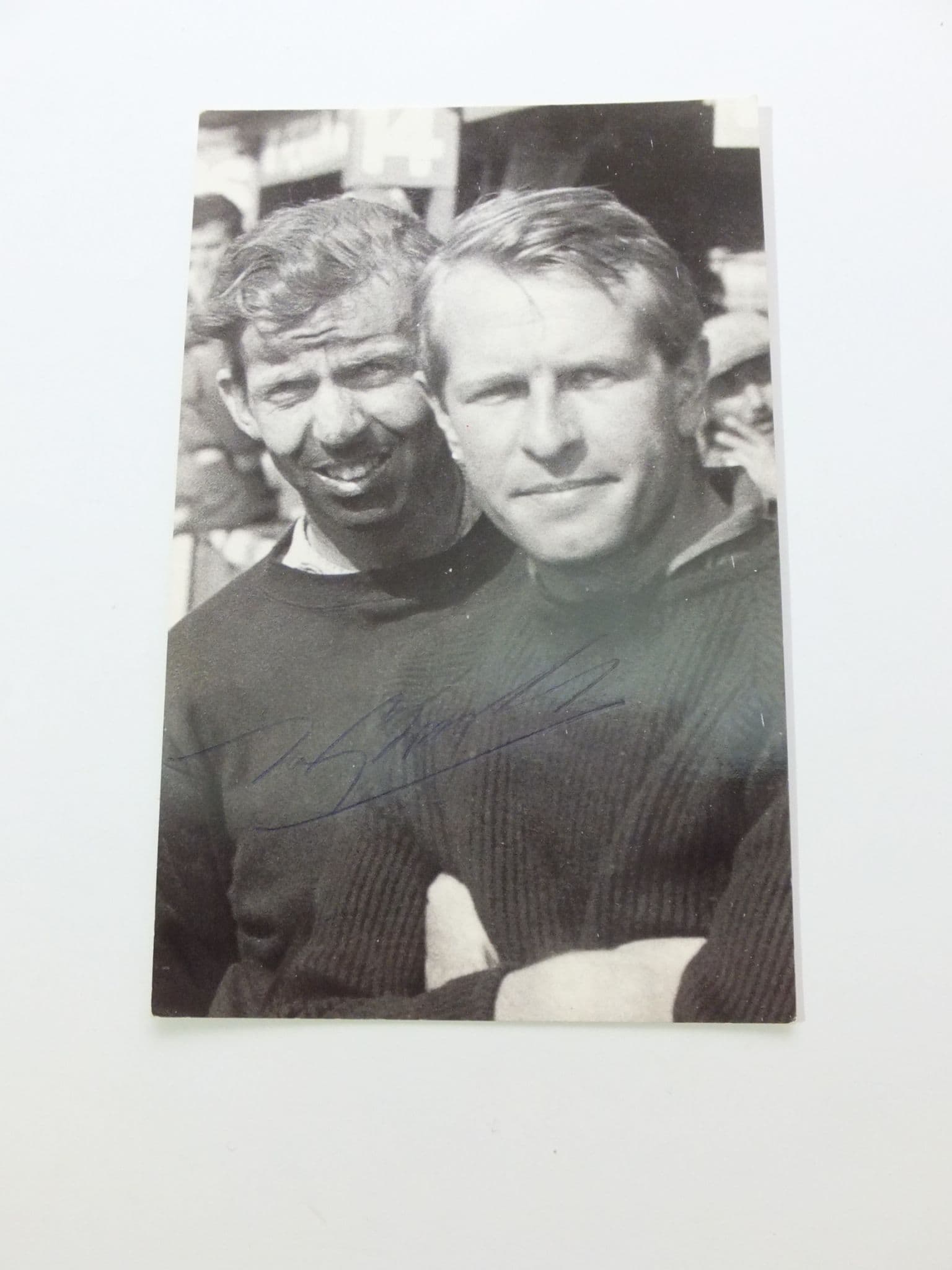 The GRAND PRIX COLLECTION  postcard with shot from 1958 of Tony stood with Peter Collins.  Signed in blue biro on the back and less visibly on the front