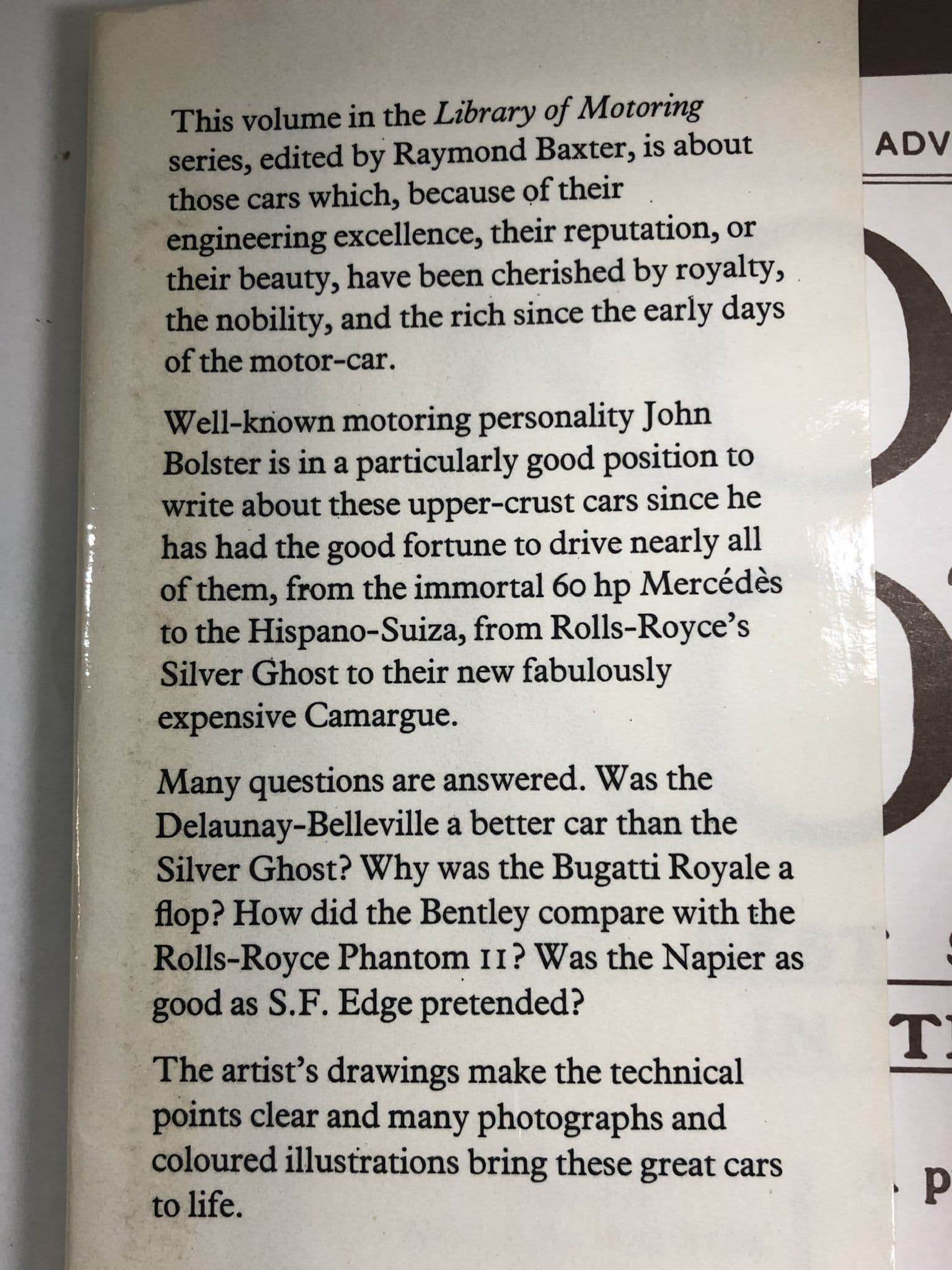 .AUTOSPORT road test editor and long time veteran and vintage car enthuast John Bolster takes a look at the top end of the market as it was through motoring history. The cars for the royals, the titles, the very rich and the very famous. Rolls-Royce Silver Ghost,  Bugatti Royale, Hispano-Suiza, through to Docker's Daimlers in the 50s and Mercedes 'Grosser' in the 70s. 200 pages, published 1976. Very good condition and in a very good jacket